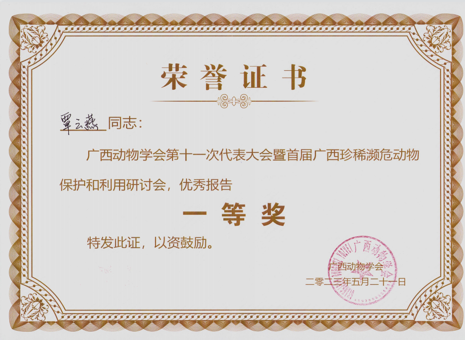 5月21日,广西动物学会第十一次代表大会暨首届广西珍稀濒危动物保护和利用研讨会在梧州学院召开。m88明昇副院长贝永建带领课题组成员参加了此次大会,2020级生物技术专业的覃云燕同学在优秀学术报告评比中获得一等奖。