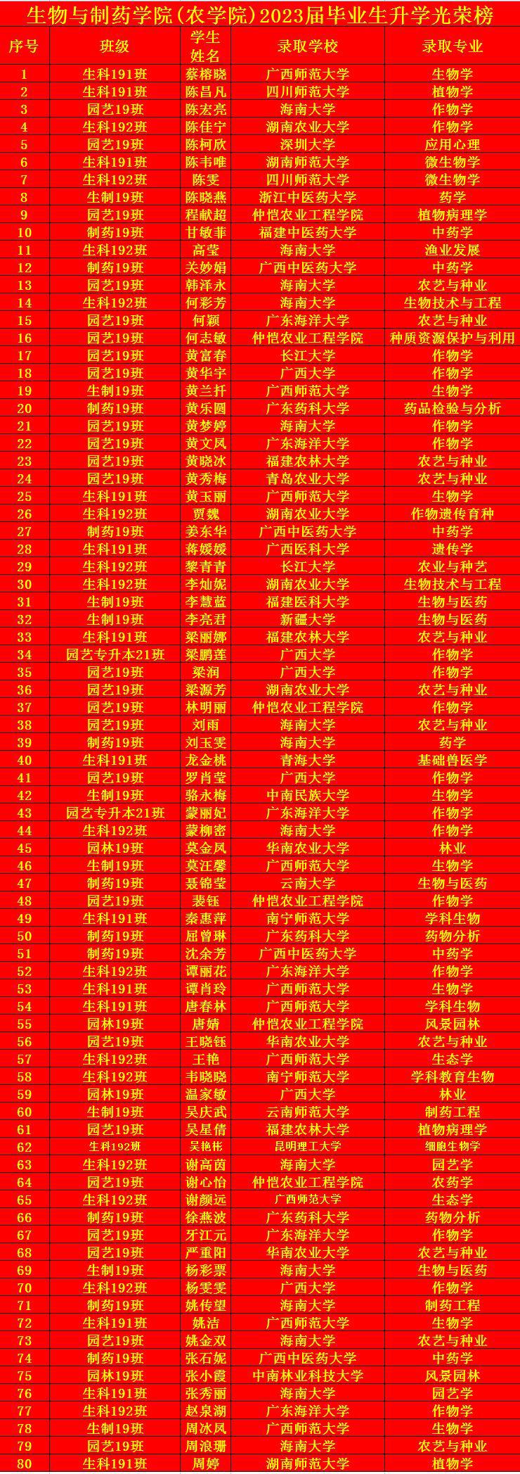 在学校党委、行政领导的关心指导和大力支持下,m88明昇2023届毕业生考研升学再续佳绩!m88明昇2023届本科毕业生339人,录取总人数80人,录取人数居全校第一,其中,普通本科学生录取78人,录取率34.8%,成绩斐然。录取高校涵盖国内多所知名学府,29人被华南农业大学、海南大学、湖南师范大学、广西大学等双一流高校录取。