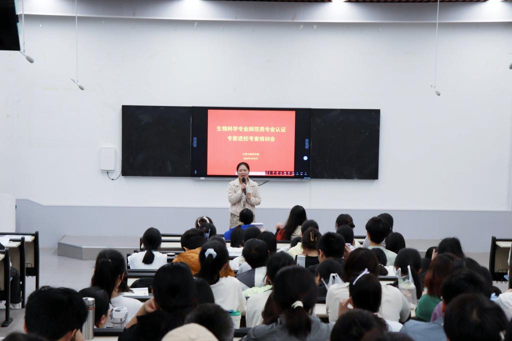 4月9日下午,m88明昇于我校东校区格物楼物理阶梯教室召开生物科学师范类专业认证专家进校考查全体学生培训会。生物科学专业全体学生参加会议,培训会由m88明昇党委副书记兼副院长张琴主讲。
