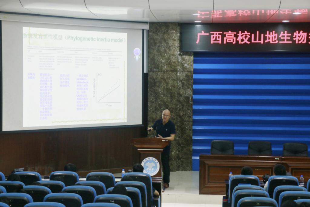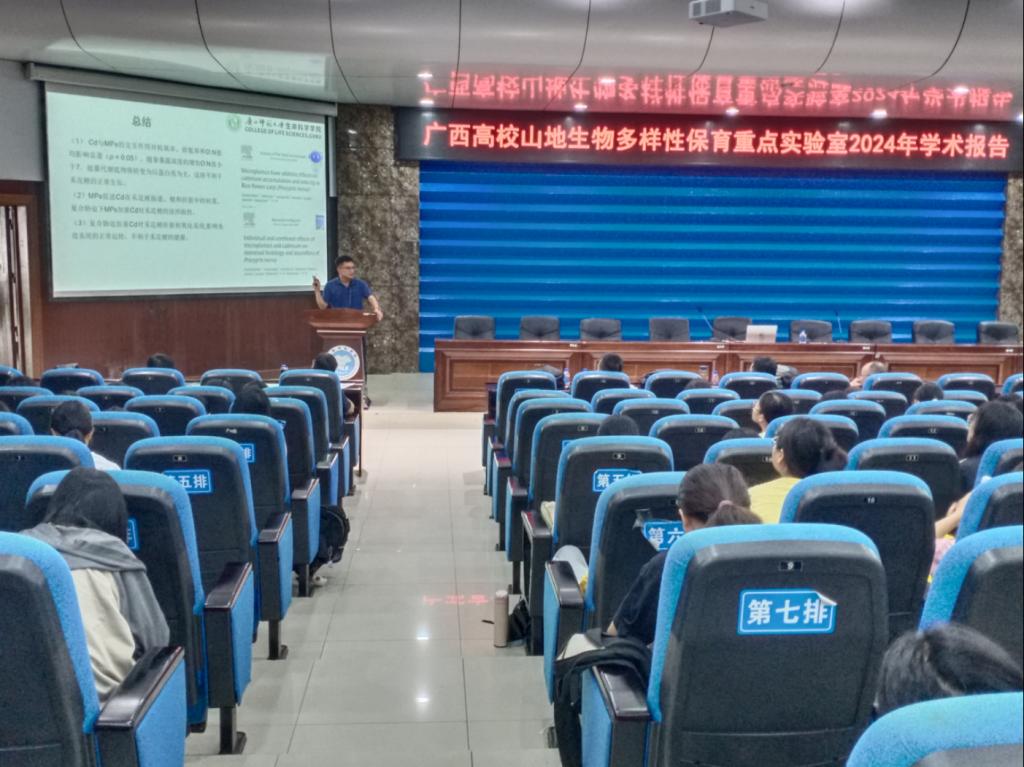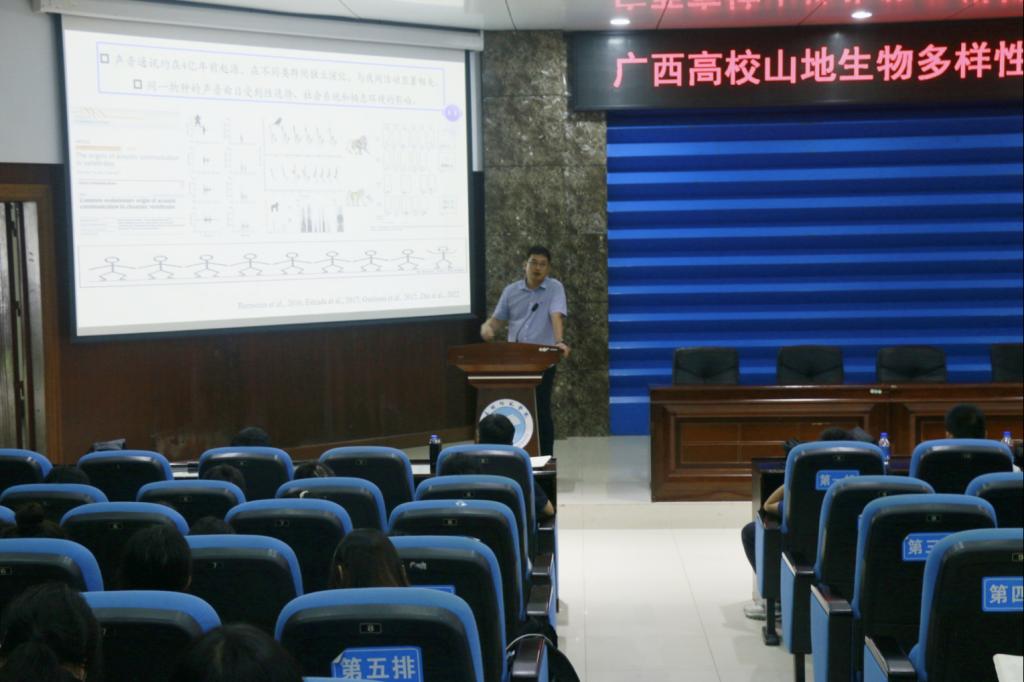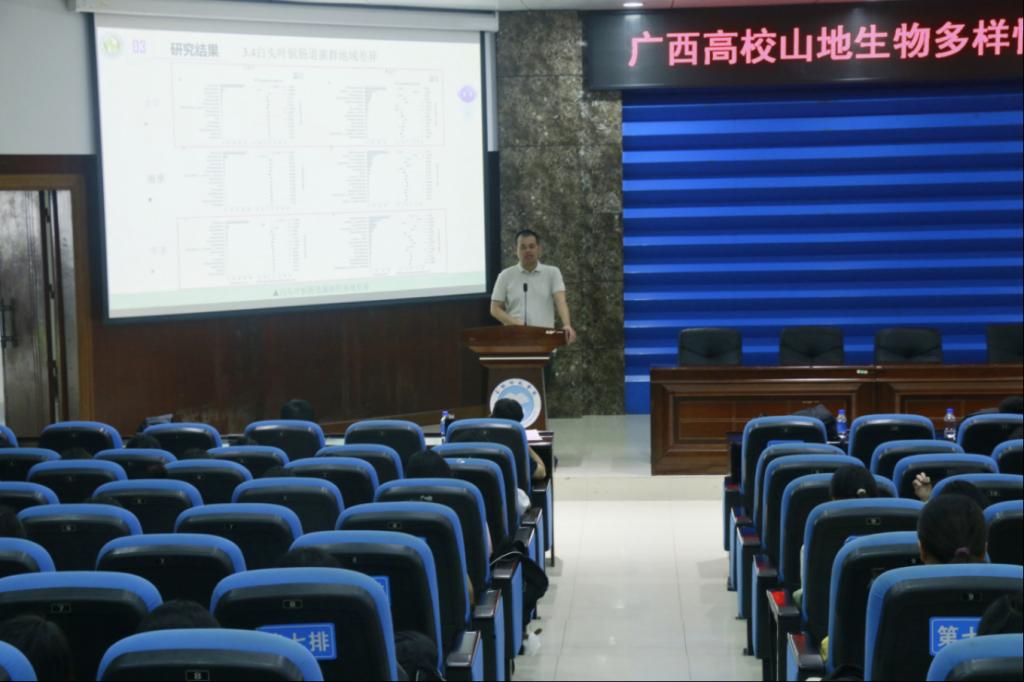 在学术报告环节,白坤栋教授做题为“植物生物地球化学生态位保守性研究进展”的主题报告;黄中豪教授做题为“石山灵长类的肠道菌群与生态适应”的主题报告;范鹏来副教授做题为“白头叶猴声音通讯:多样性、适应和功能”的主题报告;蒋骄云副教授做题为“Cd对中华圆田螺的毒性效应初步研究”的主题报告。