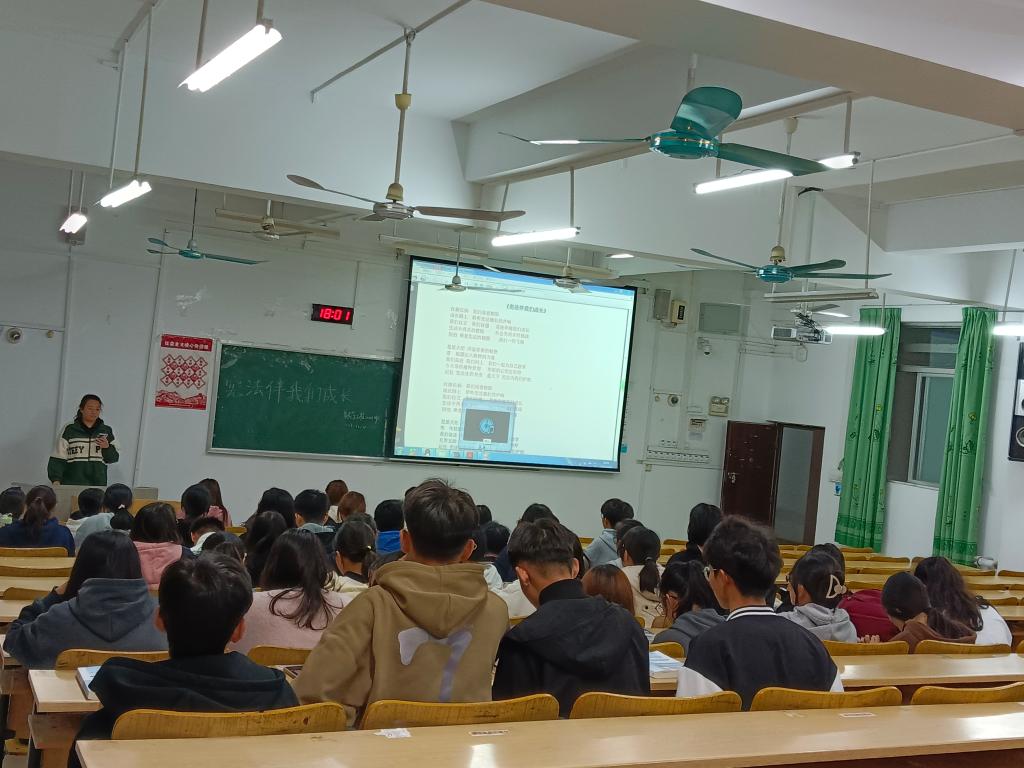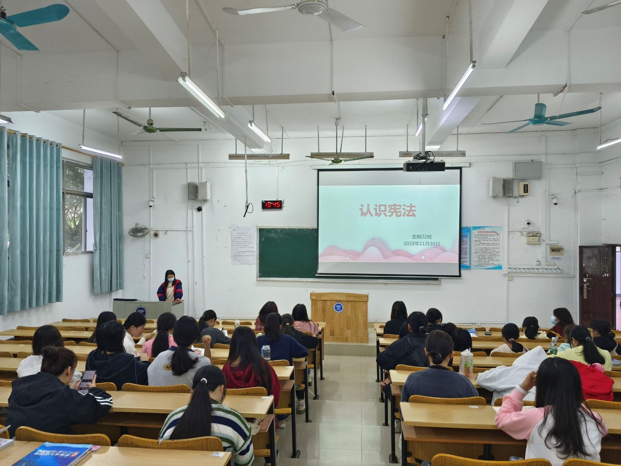 生技2023班韦惠耀通过讲述宪法精神的含义,表示学生可通过学习宪法更好地理解和实践宪法精神,为构建法治社会作出贡献。最后,该班班主任辛桂瑜进行总结,阐明开展宪法宣传周的目的,并希望全体学生能够充分认识学习宪法的重要性,形成自觉守法的好习惯。