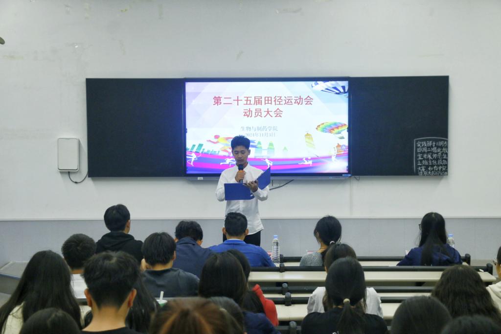 11月3日下午,m88明昇于我校东校区格物楼物理阶梯教室召开第二十五届田径运动会动员大会。会议由许珊珊、王皓主持,该院团委书记方振名、教练员代表罗国光、运动员代表陈声宇、主席团成员及全体运动员参加。