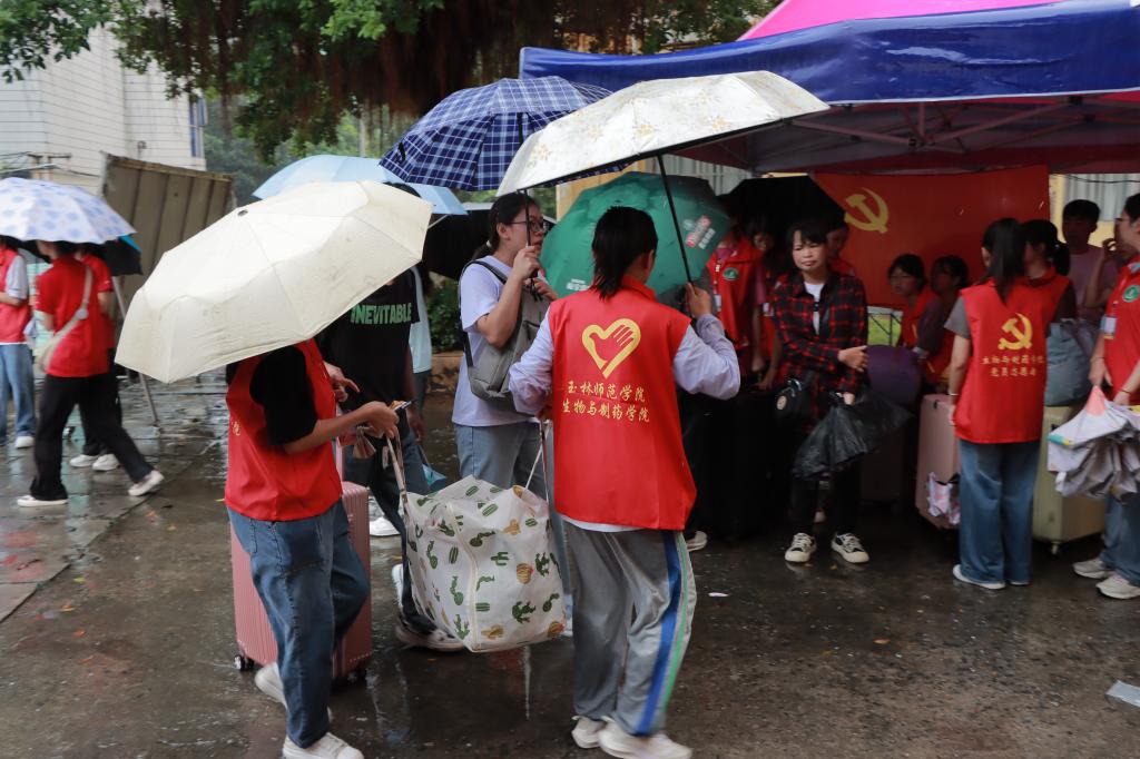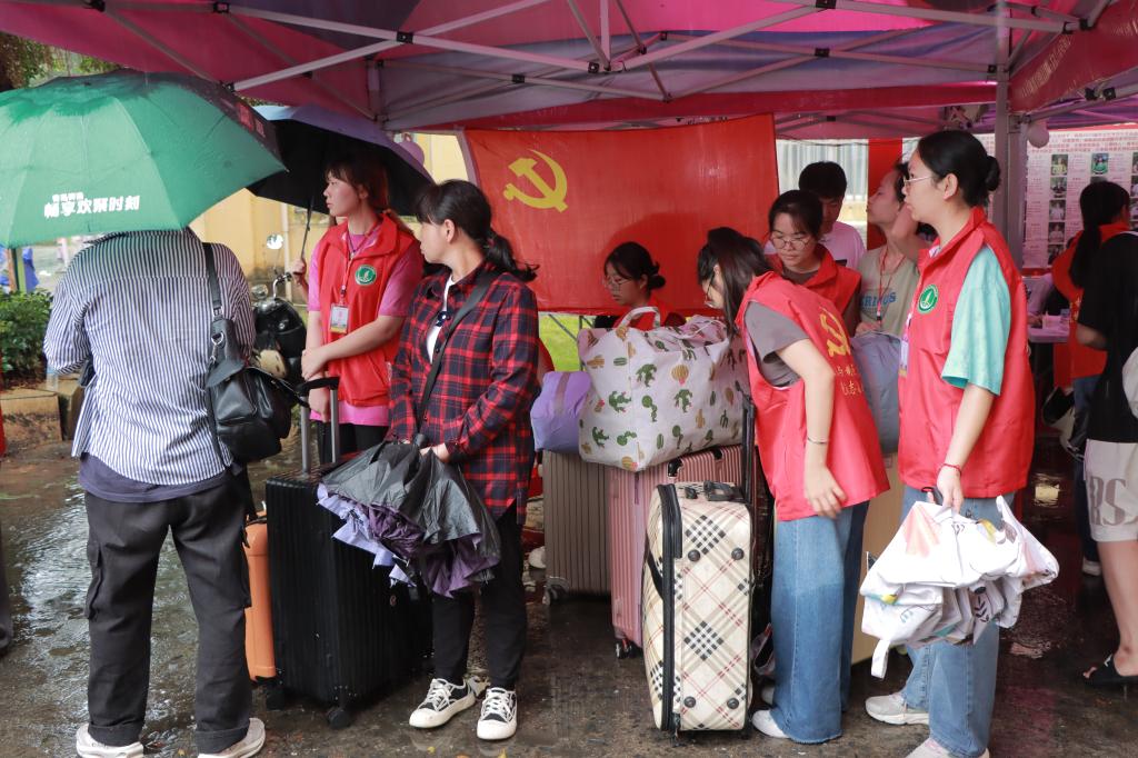 2023年秋季期新生报到注册当日,受台风天气影响,天空下起了倾盆大雨,但这丝毫不减迎新党员志愿者的工作热情,他们以饱满的面貌投入迎新工作中,充分发挥了党员先锋模范作用。他们积极引导新生办理入学手续,从新生及家长手中接过一袋袋沉甸甸的行李并引导至报到宿舍,亲切地为新生解答每一项疑惑,他们一抹抹的志愿红在校园的各个角落中形成了一道靓丽的风景。